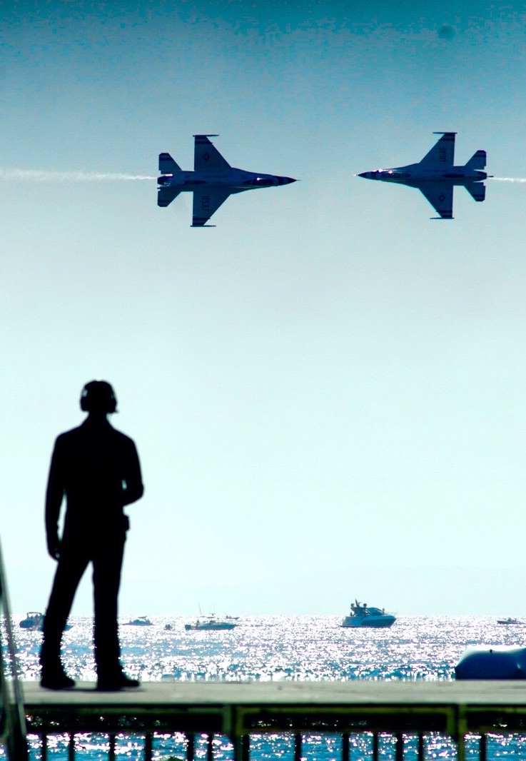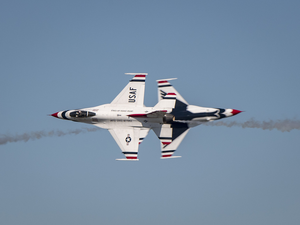2機のF-16が接触しそうになった瞬間に、パイロットは地面に対して完全に垂直になるように機体の下面がお互いに向き合うようにロールする。これが「ナイフエッジ」マニューバーの名前の由来だ。専門家たちの操縦と信頼性の高いストップウォッチのおかげで、マニューバーは滞りなく完了する。