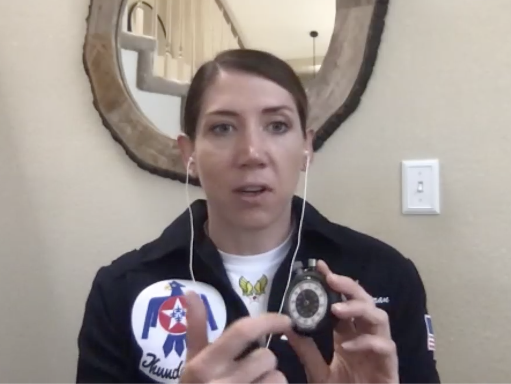 Zoomを介して、カラン少佐は、彼女がソロフライトのデモンストレーションでストップウォッチをどのように使用しているかを説明してる。