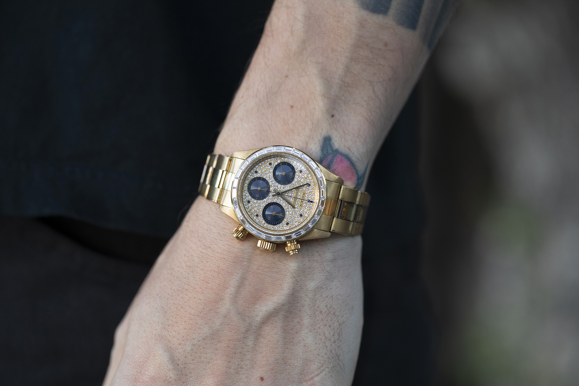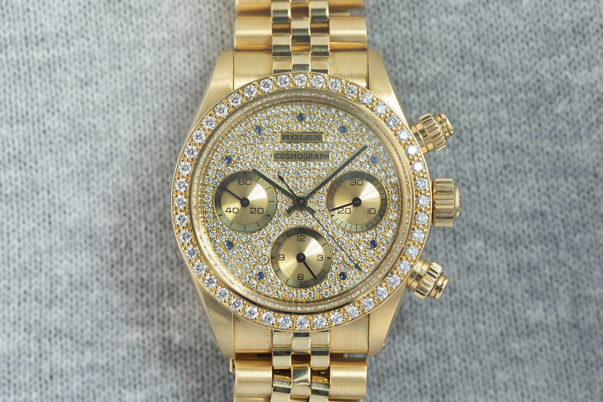 さて、ここまでは皆さんがHODINKEEやその他で見たことのあるリファレンス番号の時計をご紹介してきた。 でも、この時計は見たことのないリファレンスの手巻きデイトナであり、全く違ったレベルに入ってきたことはお分かり頂けるだろう。この6269は1980年代に製造され、手巻きキャリバーのバルジュー727を6263スタイルのケースに入れた時計。ベゼルに48個のブリリアントカットのダイヤモンドを配し、文字盤一面が240個のブリリアントカットのダイヤモンドで覆われており、時間表示マーカーには、9個のブリリアントカットのサファイアが使われている。