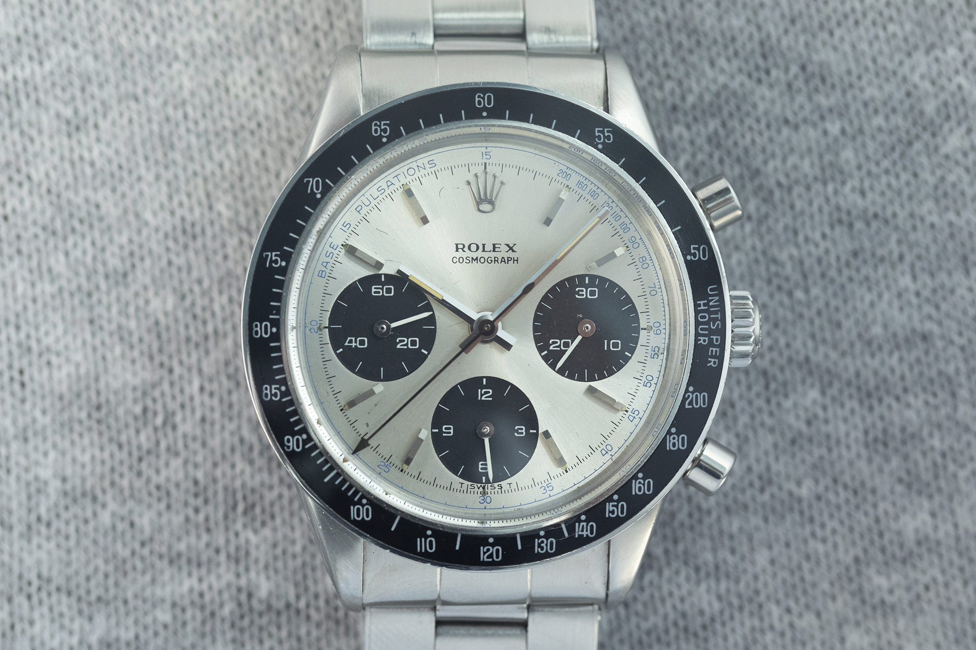 手巻きデイトナの階層を上に登ってみよう。前述の時計と同様にこの時計も貴重なRef.6264だが、PNでもなく、通常の文字盤のモデルでもない。よく見ると、”Base 15 pulsations”という文字が10時のところに見えないだろうか? そう、これはパルスメーター付きのデイトナで“ドクターズデイトナ”と呼ばれている。