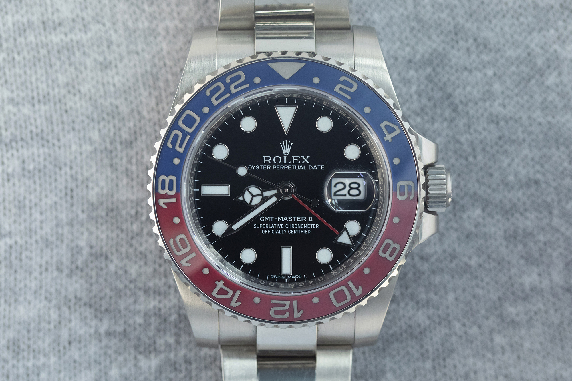 ジョンと私は、いつかコレクターが熱狂すると思える現代のロレックスをいつも探している。その意味で、この18KWGのペプシカラーベゼルのロレックスは最高の例といえる。最高のヴィンテージ・ロレックスのペプシカラーである赤と青のベゼルが18KWGのケースに入っているのだ。