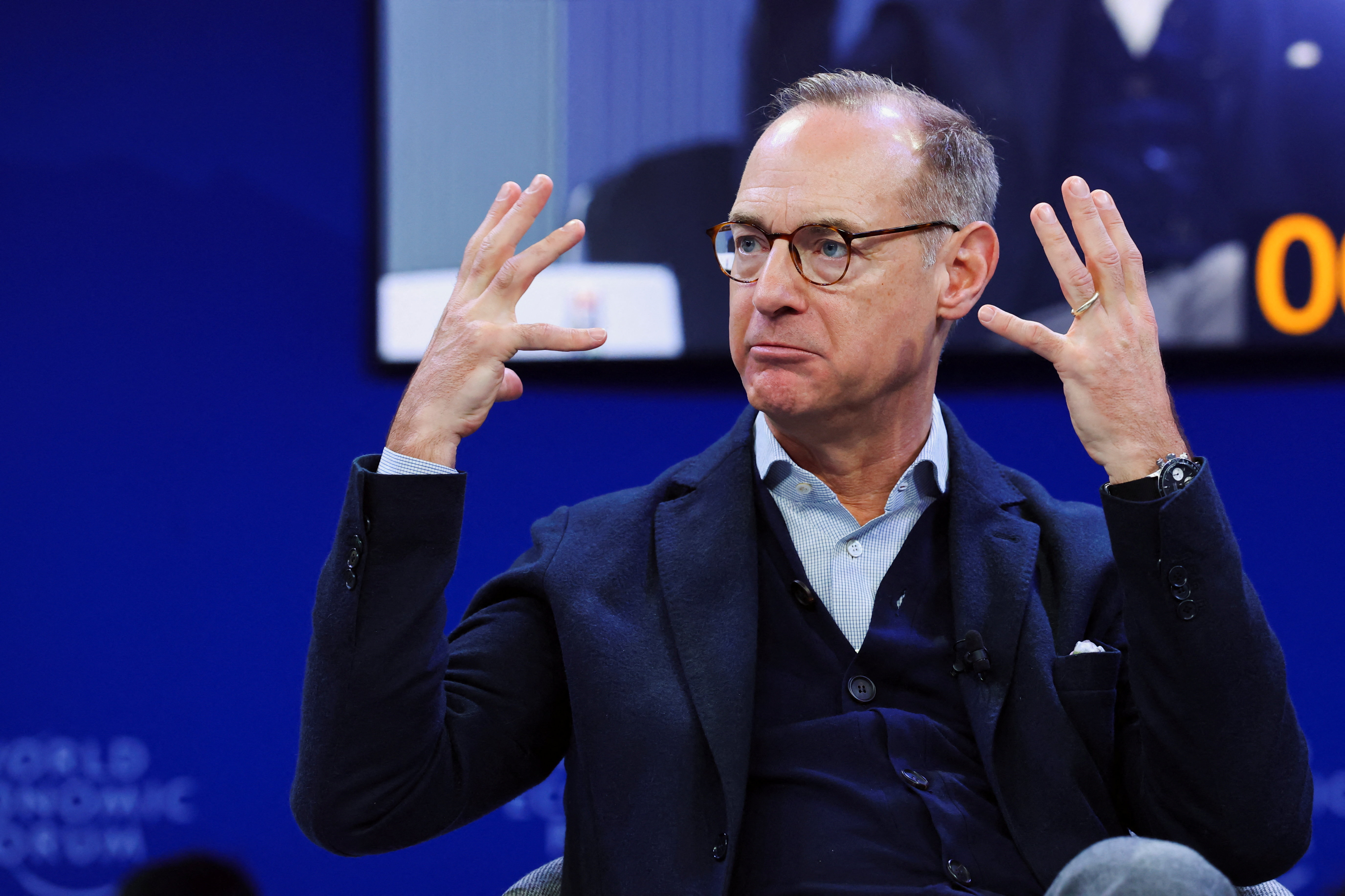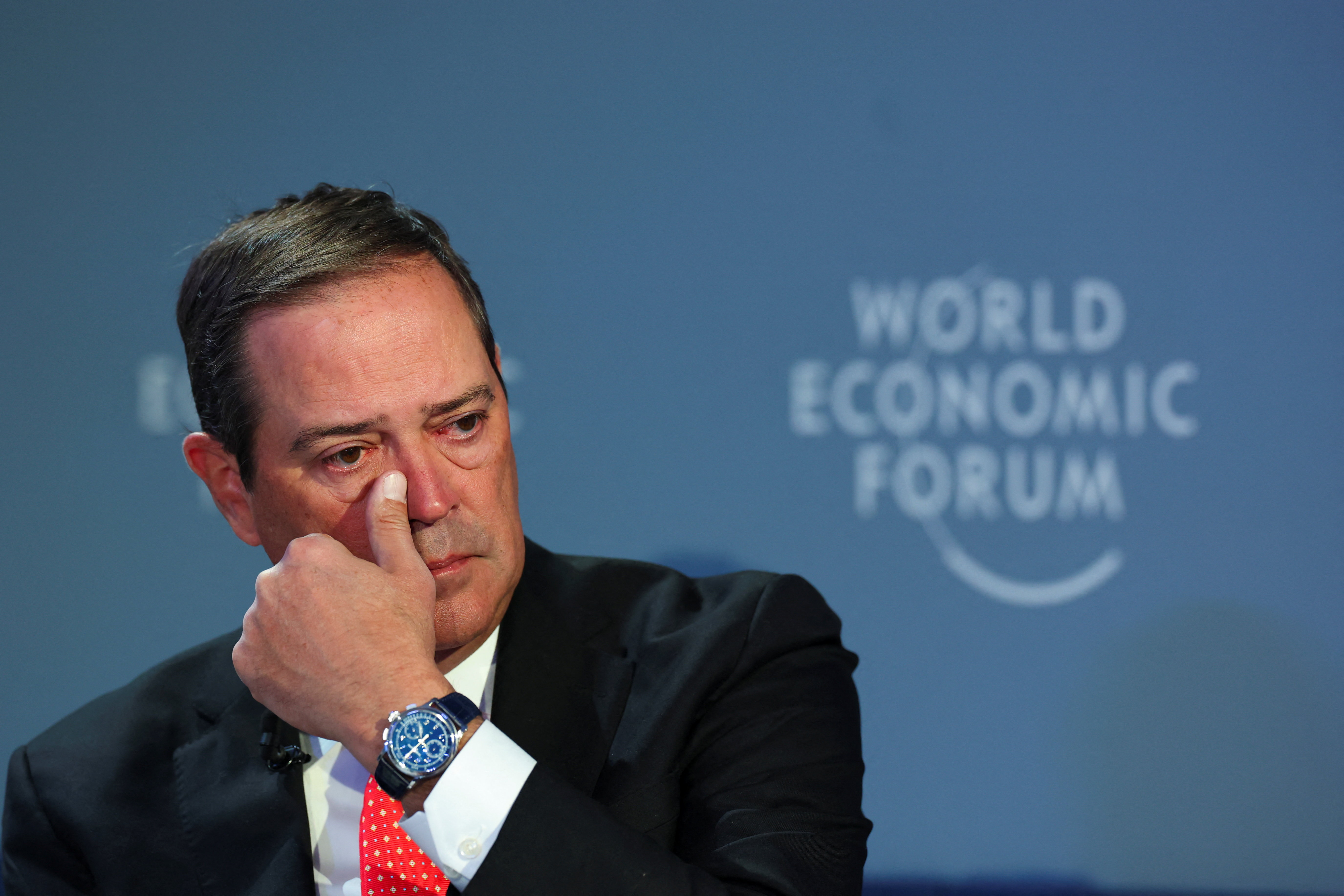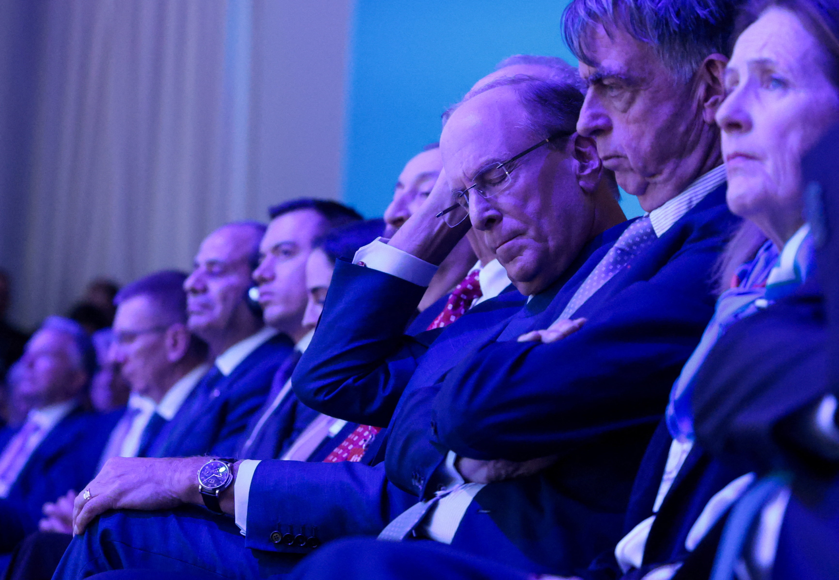 眼鏡をかけ、頭に手をやるフィンク氏の左手に注目したい。Photo by Reuters/Aflo