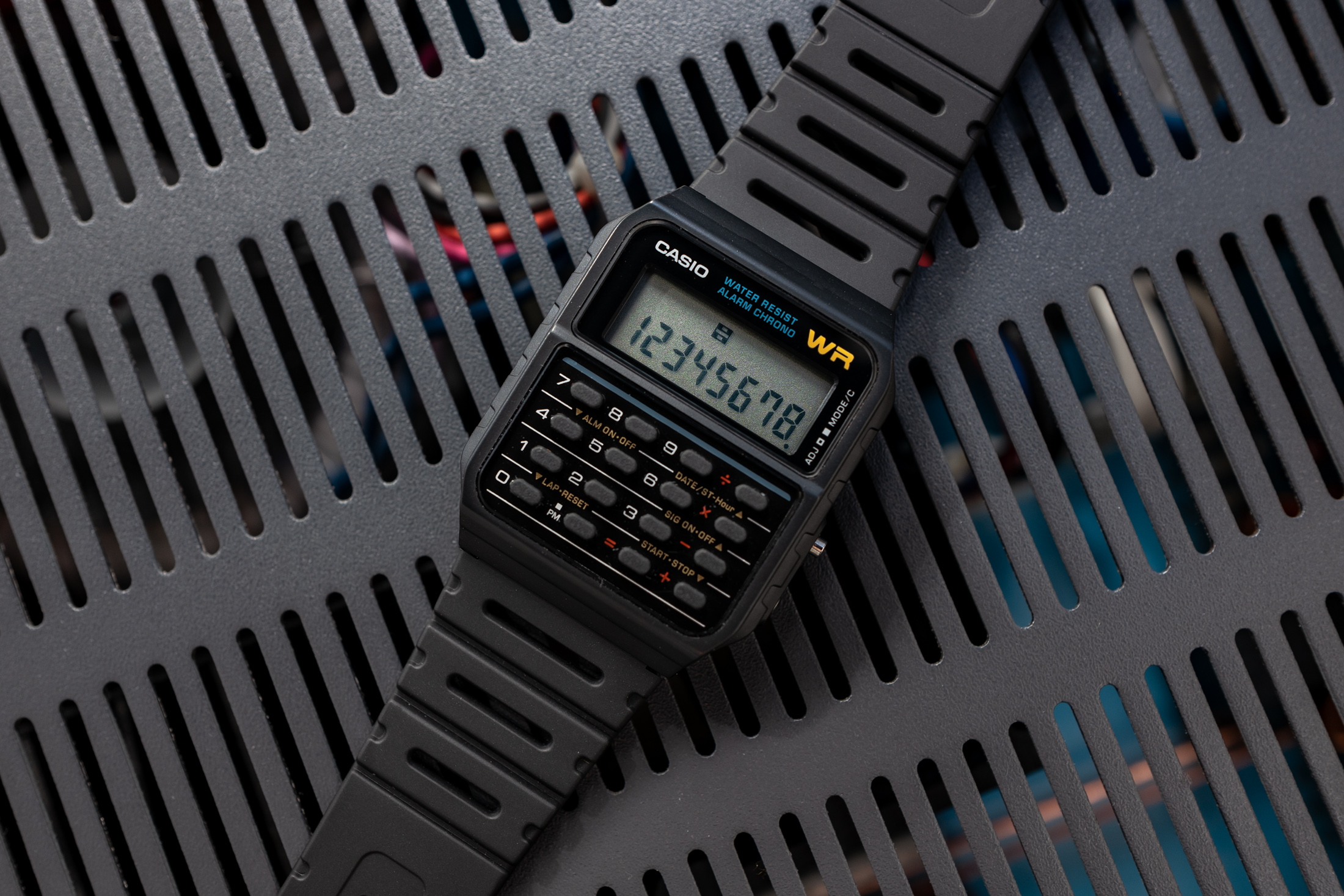 この30年の歴史の中で最もシンプルなカシオのデータバンク、現代版のCA53W-1を選んでみた。素朴な黒の樹脂製で、バックライトもない。技術的には、このモデルは何も保存できないため、真のデータバンクとは言えない。しかし、足し算に引き算、掛け算、割り算ができる。