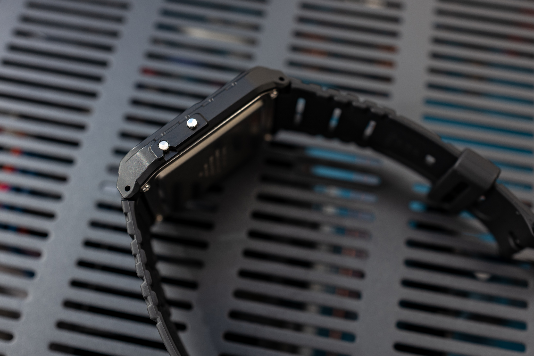 このモデルの場合、電卓のボタンは時計前面のガラスプレートのような部分に設けられている。光沢のある黒の表面に小さなゴムボタンがいくつかレイアウトされているため、集塵には事欠かないが、思っていたよりも指紋がつきにくい。