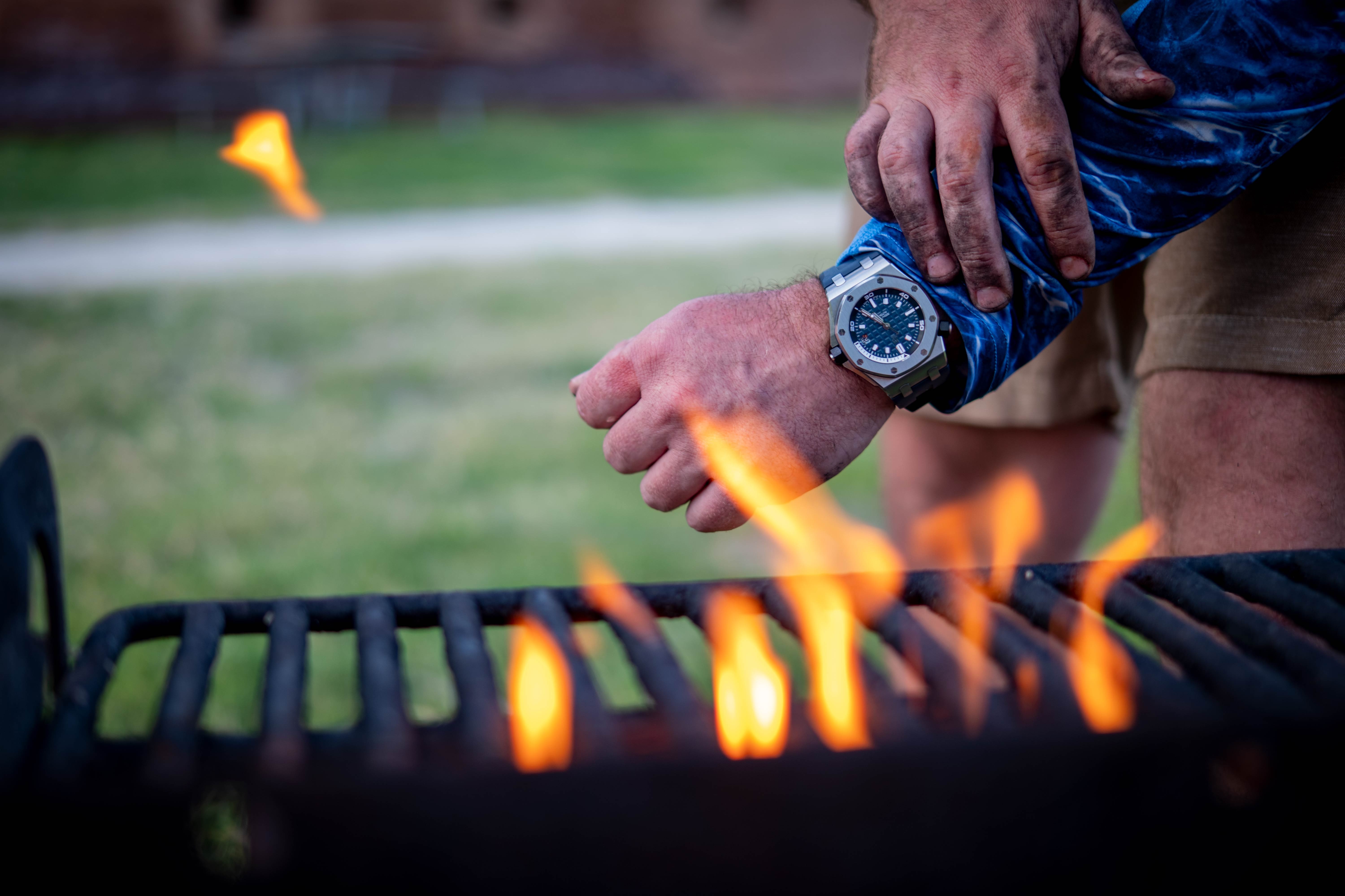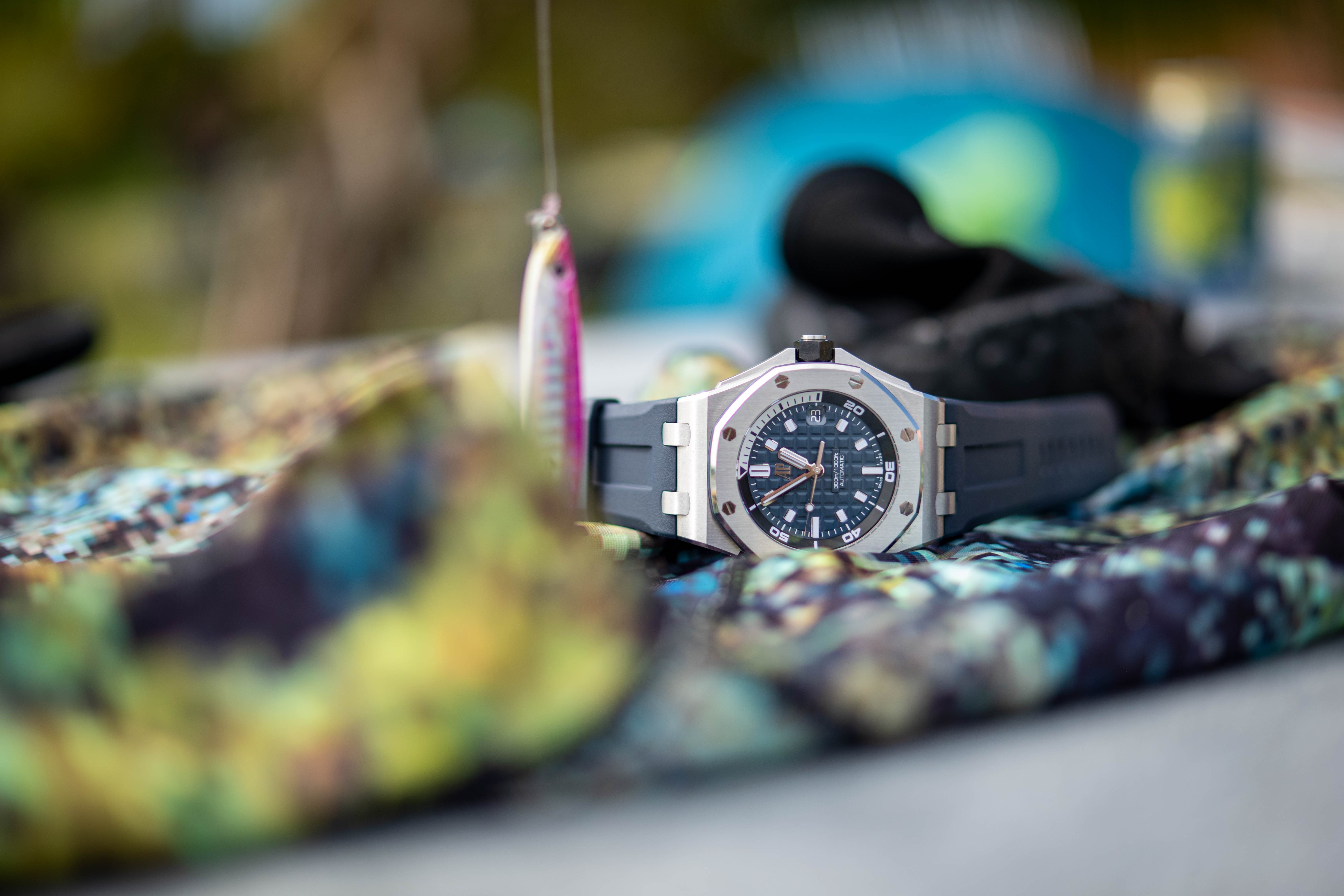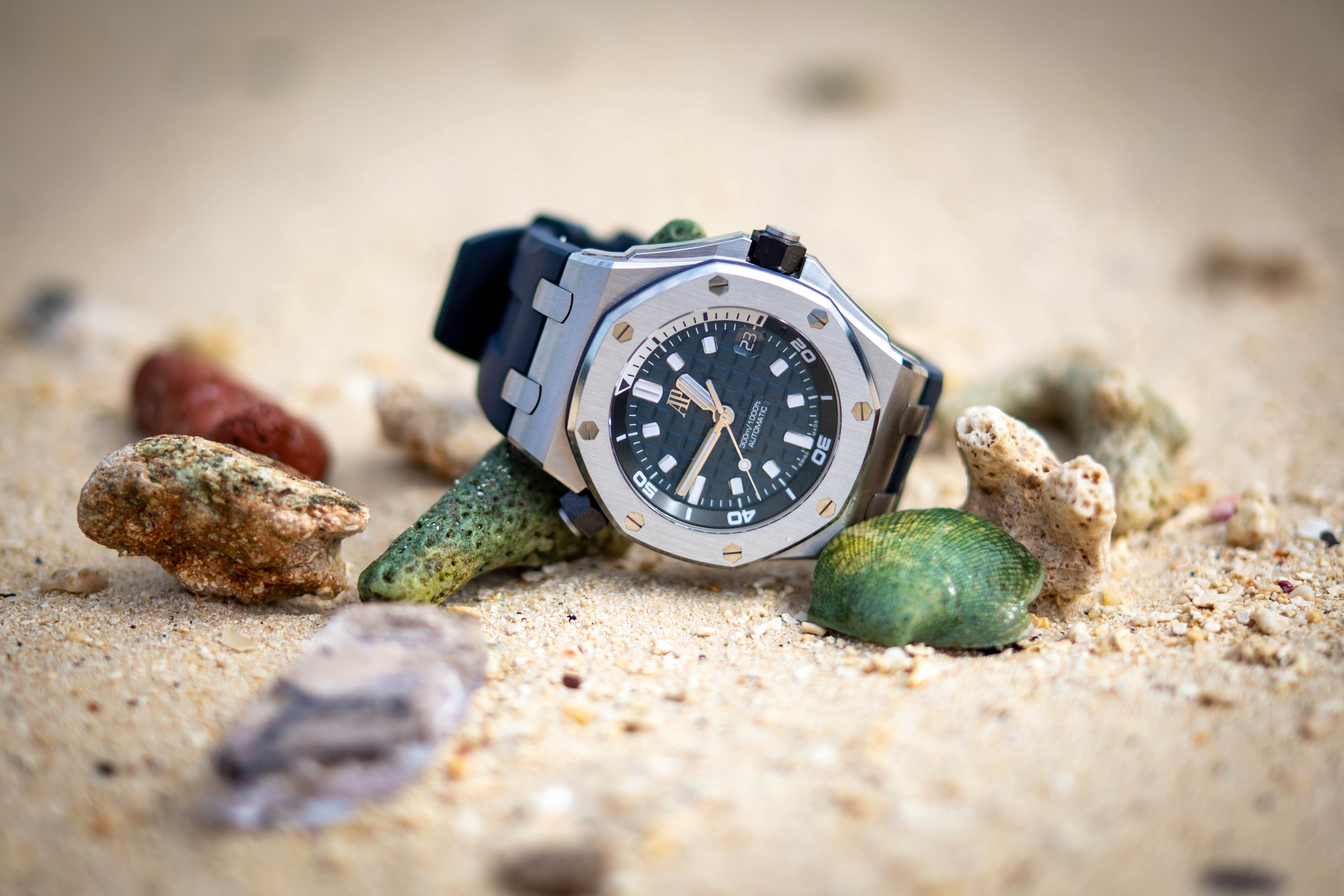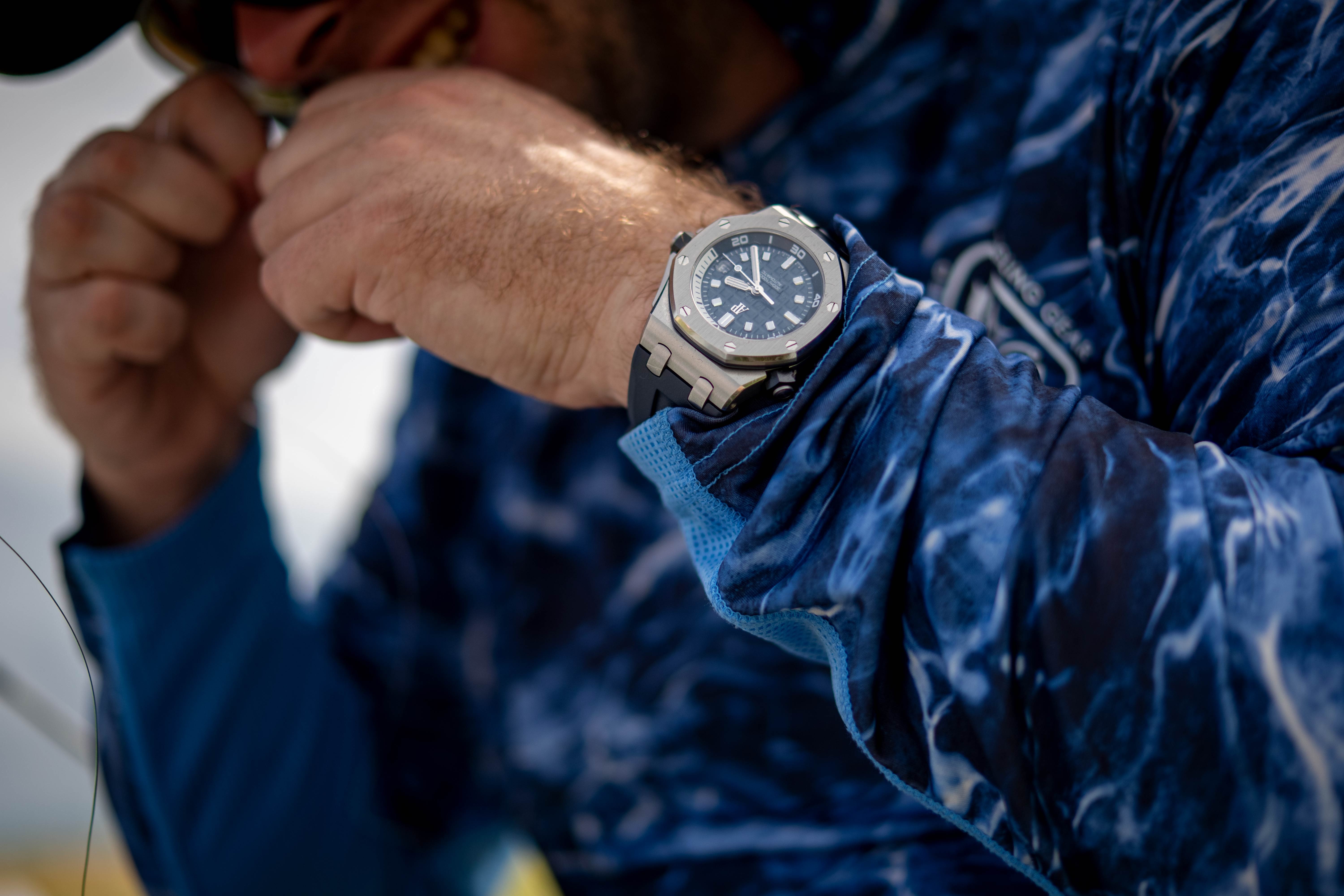 上陸の順番を待つあいだ、私はこの無人島に持っていく時計を選ぶ必要があった。しばらく考えた末に、最終的に1本だけですべてを賄う時計としてロイヤル オーク オフショア ダイバーを選んだ。いつもとはまったく違う選択だ。では、なぜ私は自分の時計の好みから大きく外れたものを選んだのか? ツールとしての時計は熟知している。しかし、不合理な熱狂の的のような腕時計を着ける機会はなかった。もしこの旅がうまくいかなかったとしても、少なくとも私にはそのチャンスがあると思ったのが理由だ。それに、この超人気の時計は無人島のような環境にも適応するものの、実際そんな風に使う人はほとんどいない。つまり私以外には誰もいないということも、この時計を選んだ動機だ。