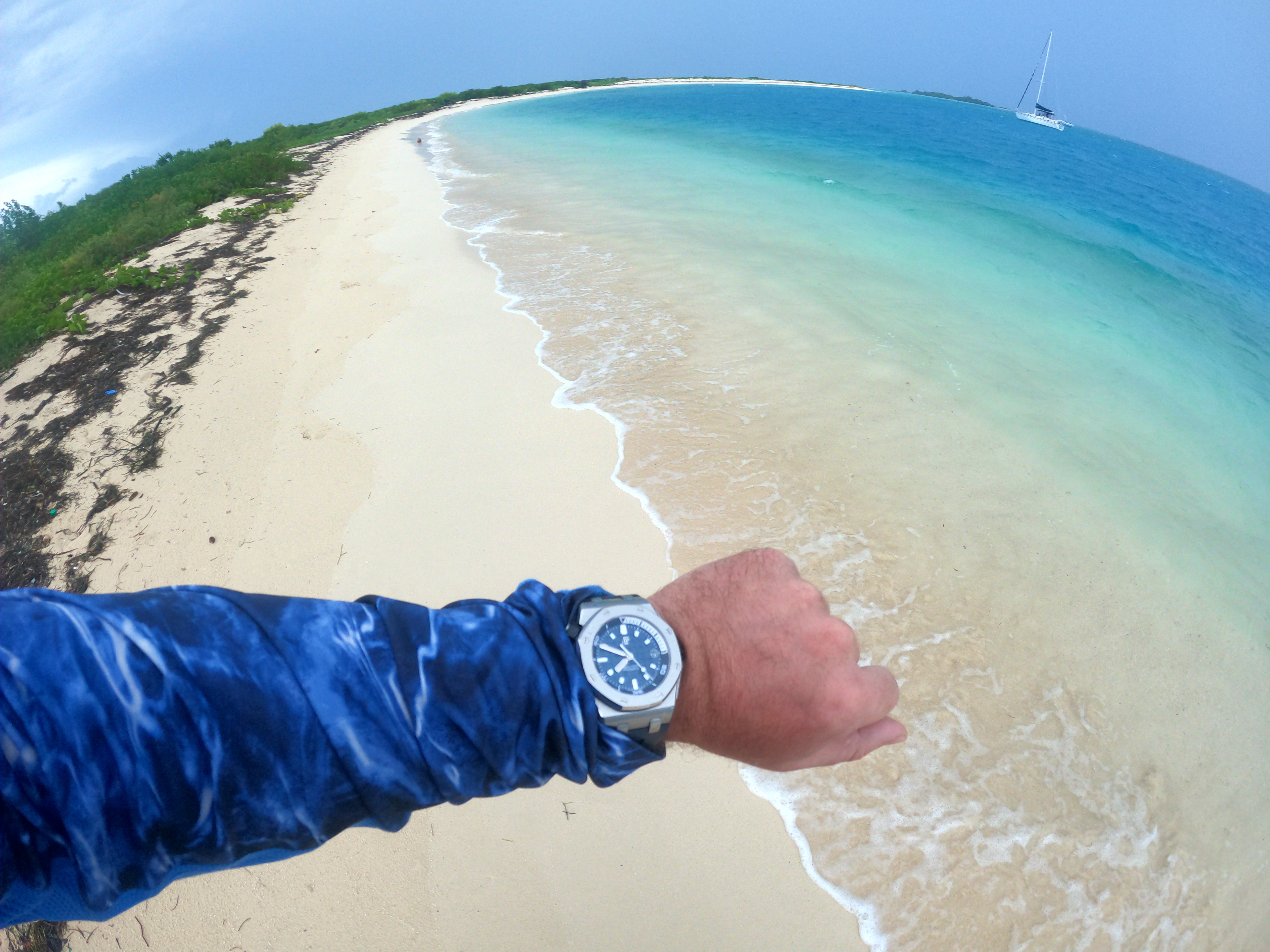 日帰り観光客が2時に船で帰途に就くと突然、島が静かになる。ようやく人里離れた無人島に来たという実感が湧いてきた。それはつまり、私が手首につけているAPを褒めてくれる人が周りにいないということでもある。一日中、誰も気づいてくれなかったのだ。驚くことでもないし、とにかくこれは私だけのものだ。ハリケーンで流されるかもしれないし、船が沈んで帰れなくなるかもしれないし、サメに襲われるかもしれないし、そのほかにも色々あるかもしれない。離島で息絶える想定などいくらでも思いつくが、少なくとも私はこの時計を着けているだろう。サバイバルに適した時計を選ぶべきだと言う人がいるかもしれない。しかし、実際には時計は何の役にも立たないのだから、思い切って好きな時計を着けた方がいい。