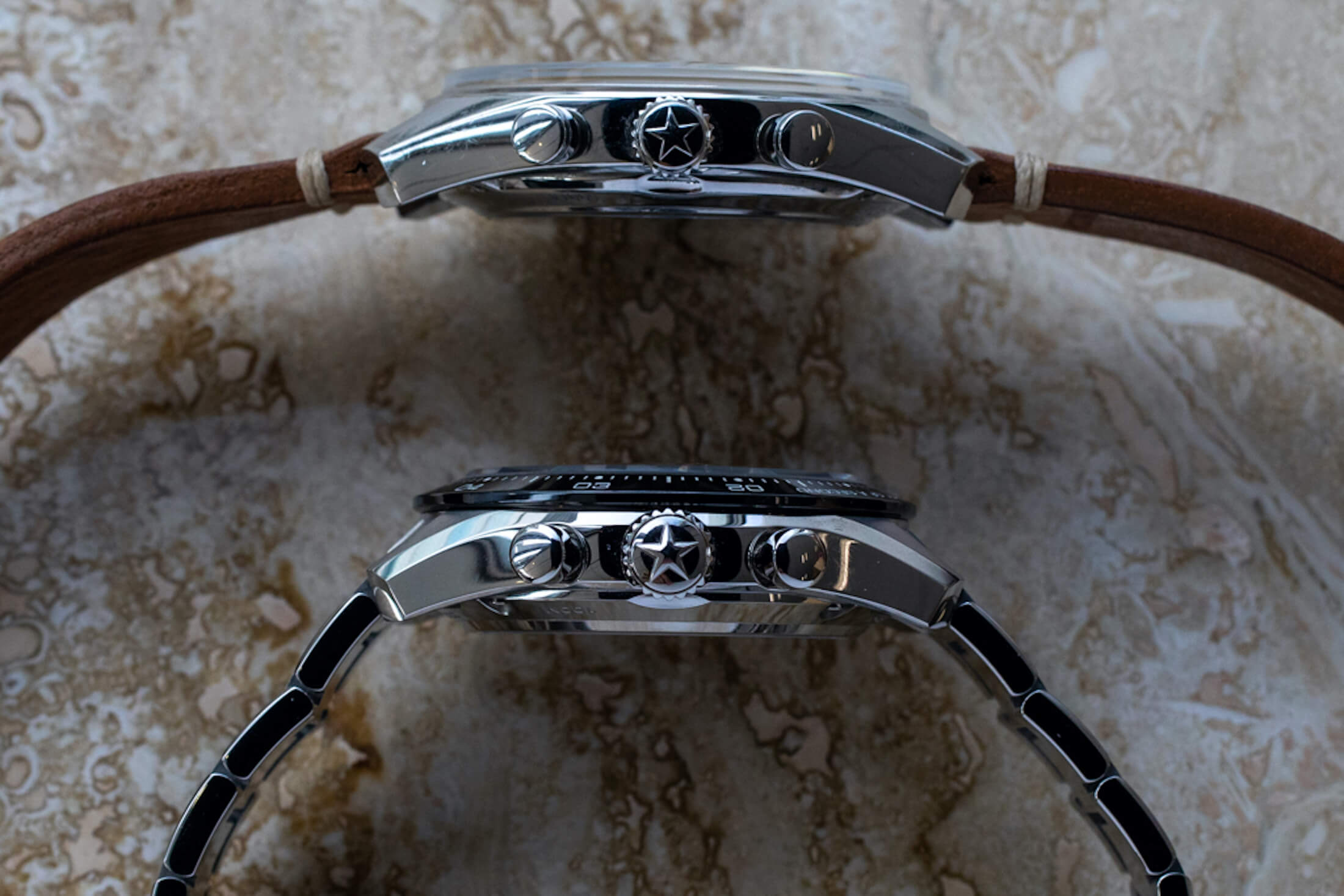 ケースバックやプッシャーなど外装の主たる部分を見ていくと、やはりかなりの共通点を感じることができる。特徴的なポンププッシャーやケースバックの形状などはほぼ同一(オープンではラグに達していた裏蓋のネジ穴をスポーツではより内側に収めるなど、より効率的に改良されているものの)だ。全体のデザイン面については、1980年代後半に存在していた「デ・ルッカ」モデルからケース形状のインスパイアを得たとゼニス側は説明しているが、オープンモデルのケースをよりコンパクトにしたような印象だ。下の比較画像を見るとわかりやすいが、スポーツのラグはより短く角度がついており、42mmと41mmのサイズの差以上に手首での装着感に差が出そうだ。ラグからラグまでの長さを実測してみると、オープンの50.0mmに対してスポーツは46.7mmで、3mm以上コンパクトになっている。リアルな装着感は個々の手首の形状にも左右されるため一概に数字では検証が難しいが、手首周りが17cmで割と平たい形の僕は、オープンのほうが手首にジャストサイズで収まる印象で、スポーツでは手首の内側でコンパクトにまとまった。ラグ形状の恩恵もあり、この2本の装着感ではクロノマスター スポーツに軍配が上がると感じた。ちなみに厚みはオープンが14.05mm、スポーツが13.6mmとなっている。