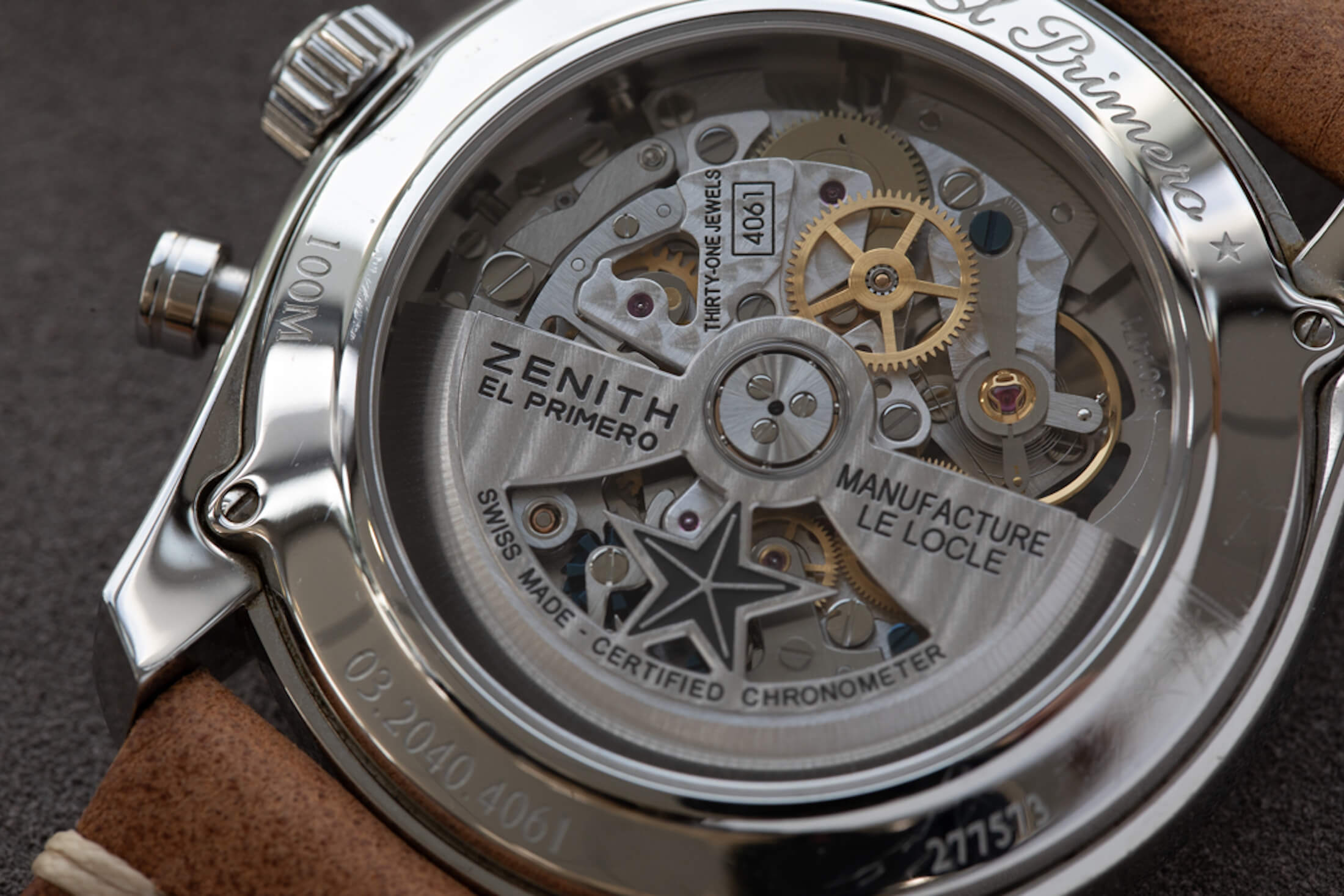 ムーブメントについては、以前公開している記事「Introducing ゼニス クロノマスター スポーツ、新しいエル・プリメロ キャリバー3600を搭載」で本国の編集長ジャック・フォースターがより詳細に解説しているため参照いただきたいが、端的に説明すると、50年前の設計でよく言えば贅沢な仕様だったエル・プリメロ400にいくつかのアップデートが加えられたものだ。技術的な改良としては、これまで4番車によって駆動されていたクロノグラフの輪列をガンギ車のピニオンによって行なうよう改められた。
